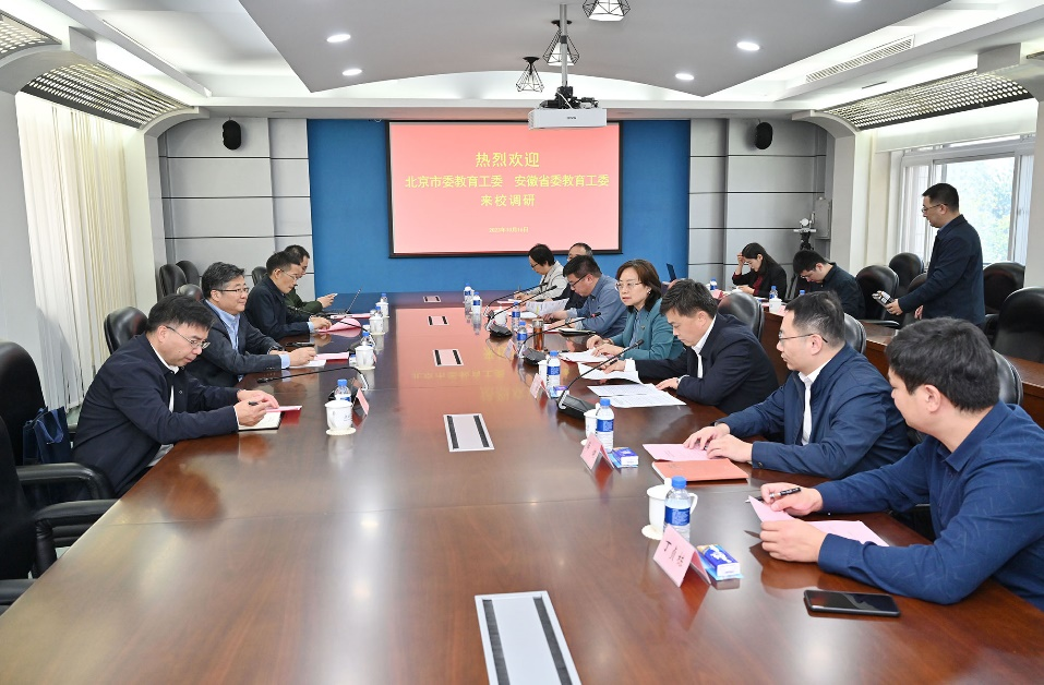 2023年10月16日上午,为推进“时代新人铸魂工程”,构建高校思政工作新生态,中共安徽省委教育工委副书记王佩刚带队赴CableAV 调研并开展座谈会。中共北京市委教育工委宣教处处长于海出席并主持座谈会。CableAV 党委副书记文海涛、安徽省教育厅思政处处长王后林、北京市学校思想政治工作中心主任薛健、CableAV 党委学生工作部部长王皓、CableAV 院长高正礼出席会议并发言。